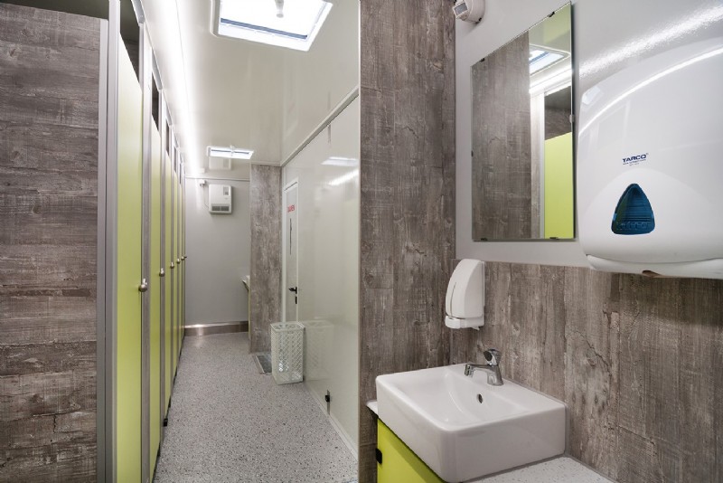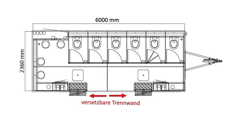 Unser Anhänger verfügt über eine verstellbare Trennwand zwischen Herren- und Damentoiletten, sodass Sie die Raumaufteilung je nach Bedarf anpassen können. Die Innen- und Außenbeleuchtung mit moderner LED-Technik sorgt für optimale Sichtbarkeit und eine angenehme Atmosphäre. Zur Zusatzausstattung gehören Heizlüfter, eine integrierte Audioanlage sowie ein spezielles Raumduftsystem. Der tiefe Einstieg mit einer Treppe sorgt für einen einfachen Einstieg in die WC-Anlage.
