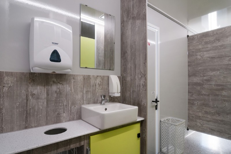 Wasserversorgung, Wandspiegel, Seifenspender mit Schaumseife, Papierspender und Abfallkorb